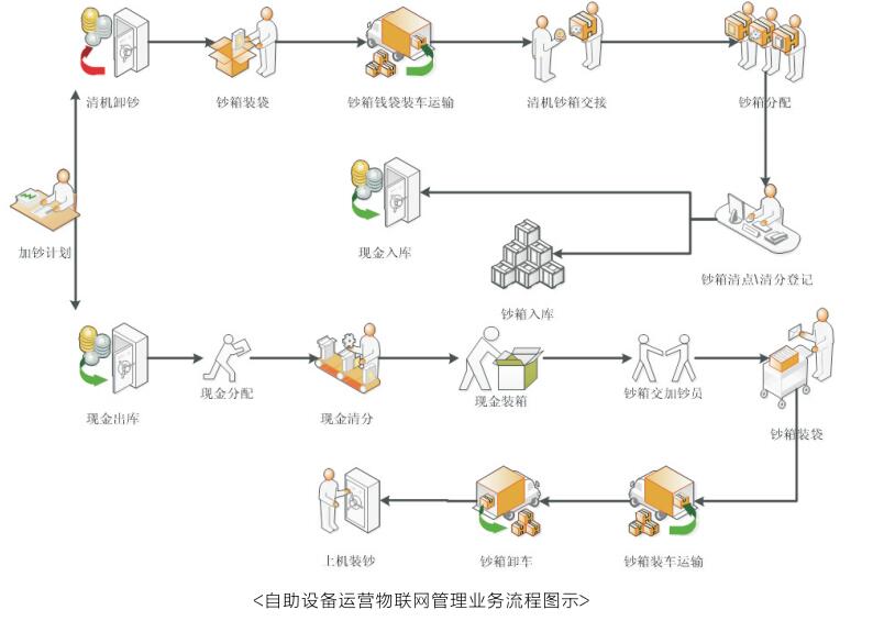 现金物联网管理系统涉及:现金整点、现金上门收款管理、自助设备运营物联网管理三个大的业务方面。这三个流程涵盖了目前银行金融机构现金处理主要业务。