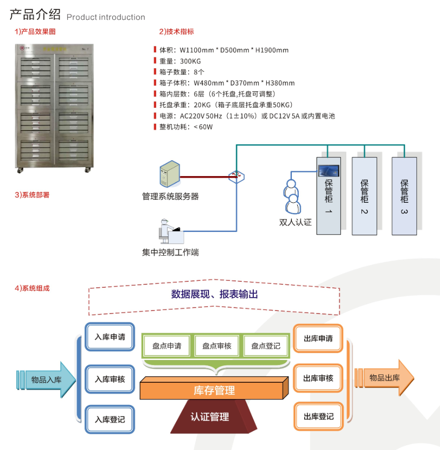 采用物联网技术和自动控制技术,为银行贵金属保管提供美观、坚固、安全的保管柜为基础;配套信息管理系统实现存取方便快捷、分级权限管理、智能库存管理的一个整体解决方案。实现银行贵金属保管的规范化、标准化、信息化、智能化,以降低贵重物品的存储安全风险,提高库房管理的工作效率。